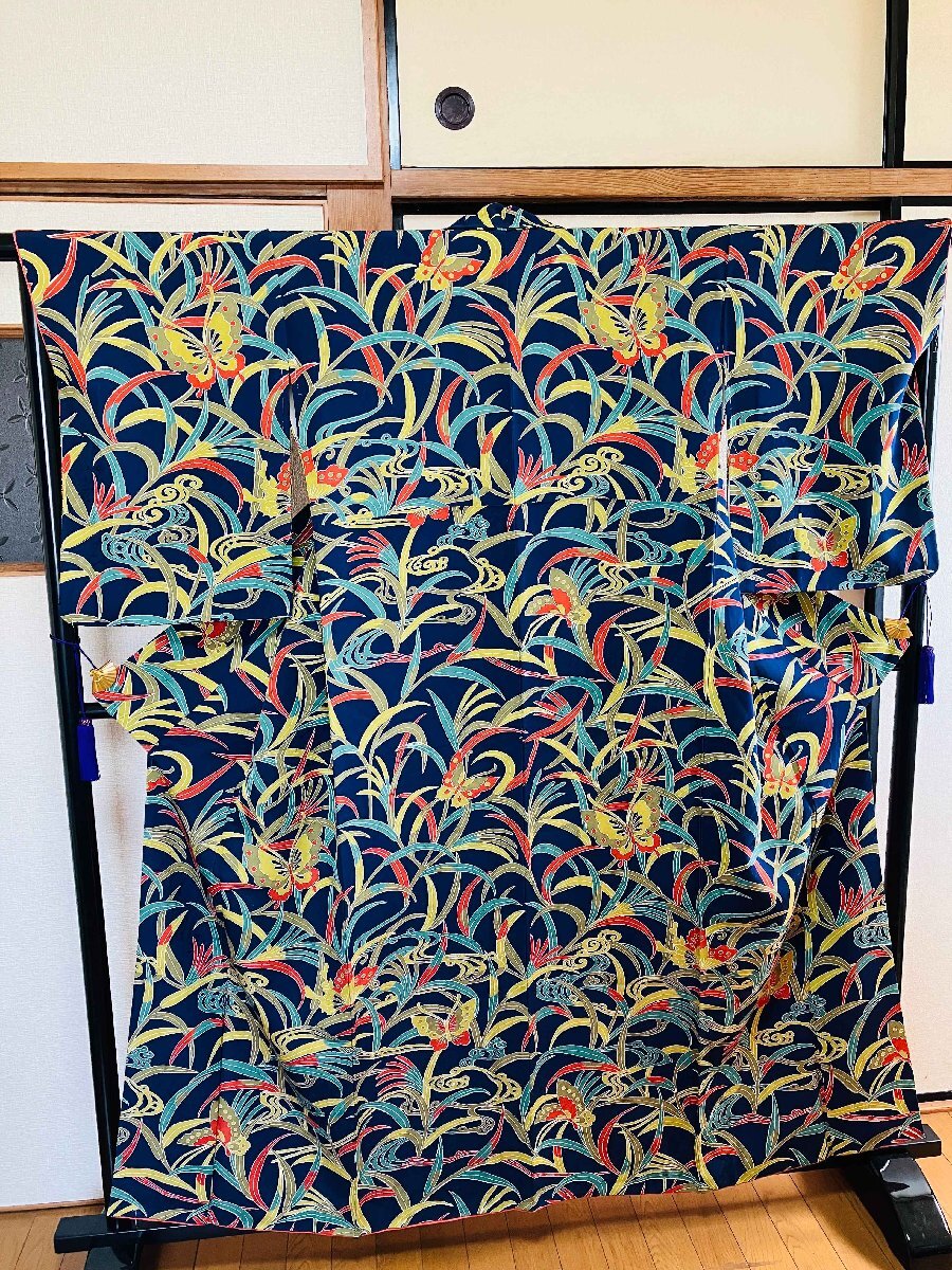- 着物 小紋 正絹 / 藍色系 / 草花文 蝶 チョウ 身丈約154cm 裄丈約67cm 袖幅約56cm 後幅30cm 前幅24.5cm TCS着物 W44