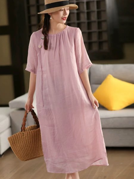 > 25nc ロングワンピース チュニック ナチュラル 苧麻100% 裏地付き ゆったり 肌触り通気性抜群 サラサラ 手作り花飾り付き パープル系