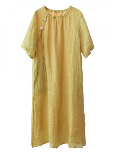 > 25nc ロングワンピース チュニック ナチュラル 苧麻100% 裏地付き ゆったり 肌触り通気性抜群 サラサラ 手作り花飾り付き イエロー