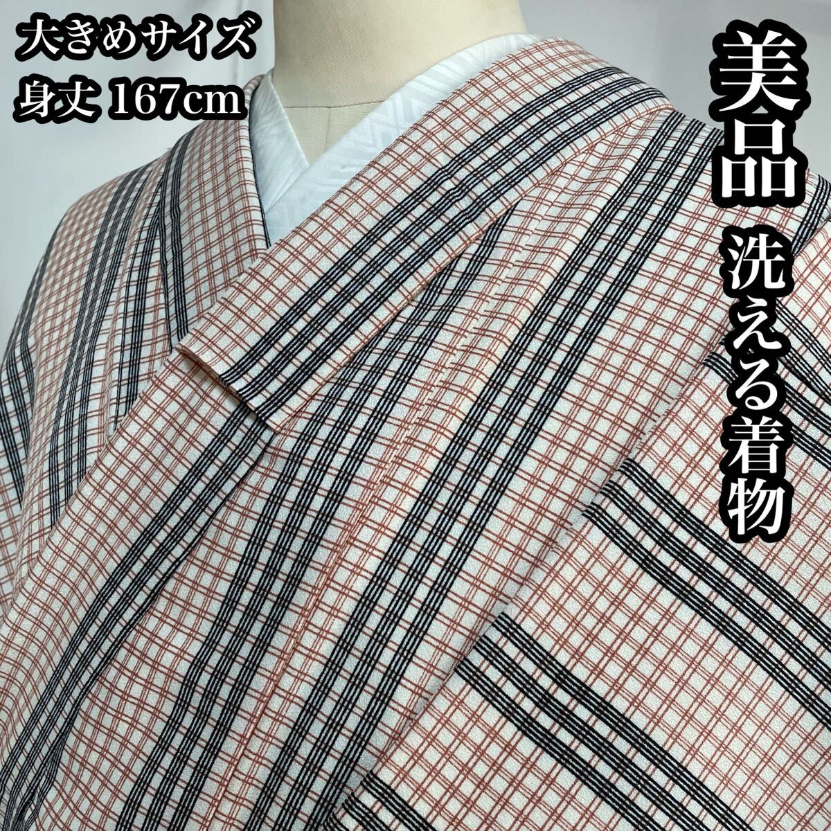 - #H554 美品 大きめサイズ 洗える着物 ポリエステル 格子 身丈167cm 裄69cm お洒落 和装 和服 着物【wellriver】