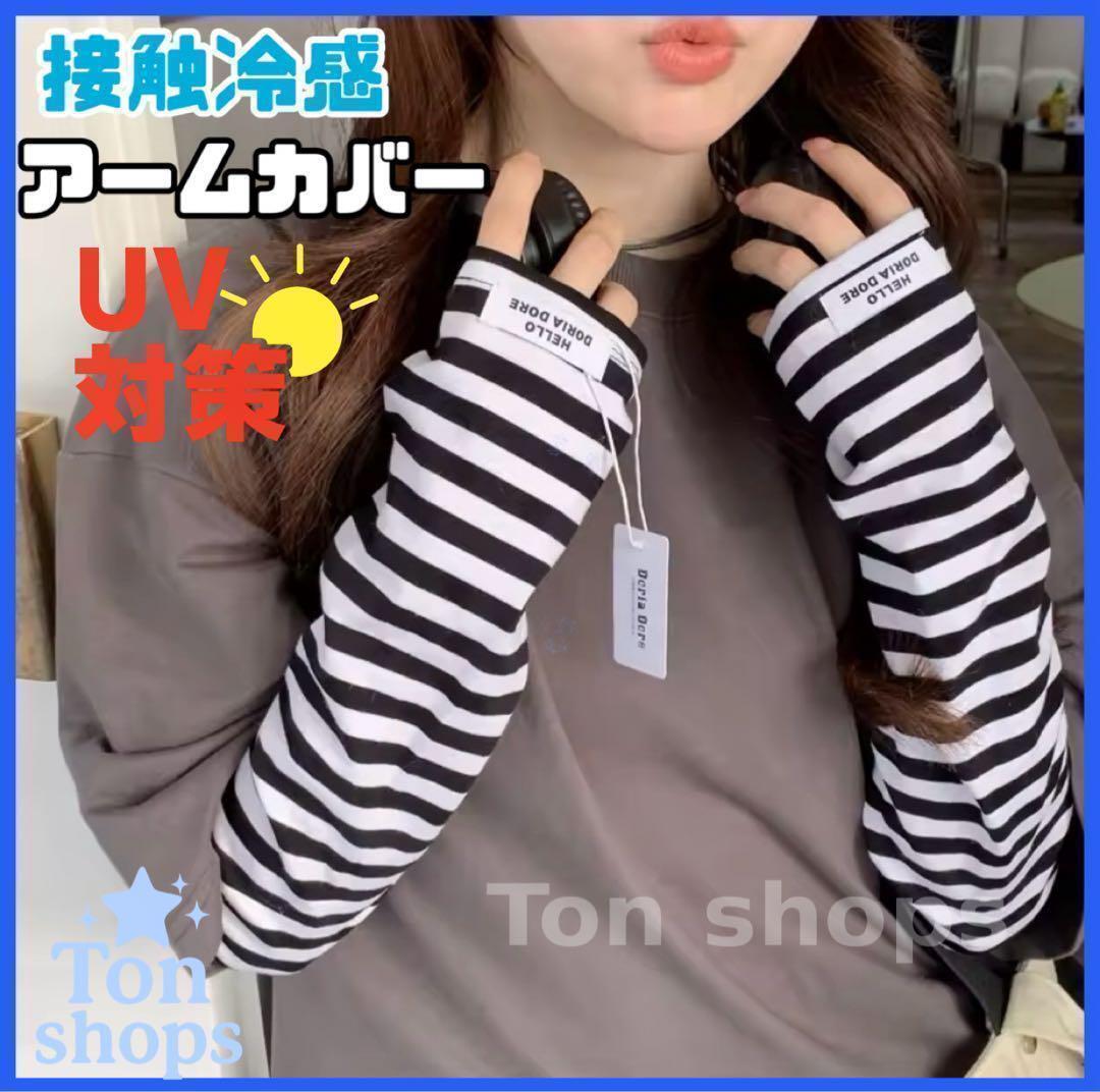 - ひんやりアームカバー ホワイト×ブラック ボーダー 紫外線対策 日焼け防止