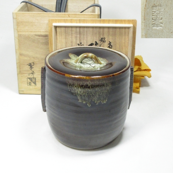 - 【B0063】茶道具 高取焼 人気作家『 青柳 翠峰 』作 陶製 高取水指 前大徳寺 大橋香林 箱書き 銘『瑞雲』 共箱 送料込み