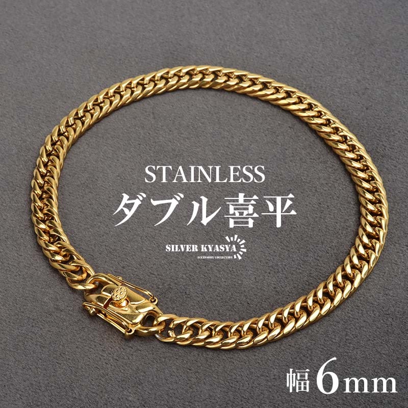 > ステンレス製 ダブル喜平ブレスレット ゴールド 18KGP 幅6mm マイアミチェーン 喜平チェーンブレスレット 細身 金アレ対応