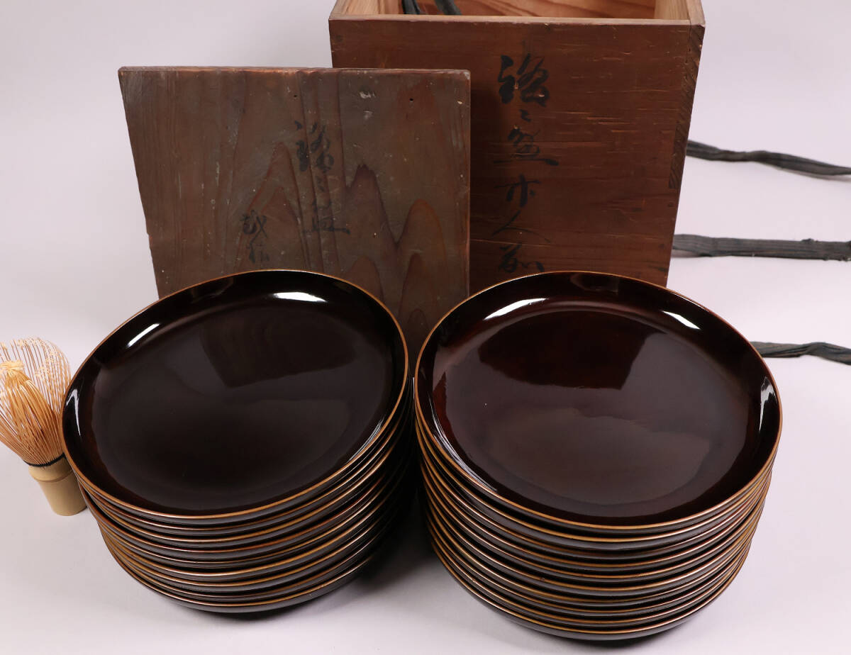 - 【MA727】時代木製漆器 金縁 黒塗銘々盆 十九客 菓子盆 菓子皿 木皿 天然木 布着 17.6cm / (検) 伝統工芸品漆芸 輪島能登京都加賀 茶懐石