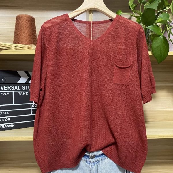 - 25zy サマーニット レディース トップス 高質 ラフ 麻タッチニット チュニック ナチュラル 麻混 サラサラ 涼感 Tシャツ Vネック 3