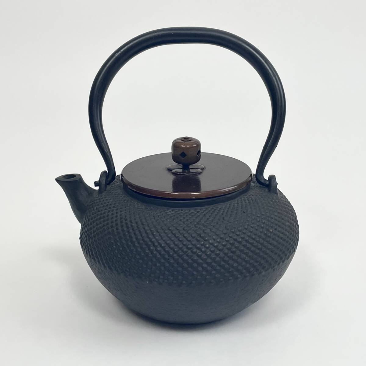 - やや小振り 鉄瓶 アラレ 霰 銅蓋 真鍮蓋 煎茶道具 無銘 時代 サビ 現状渡し