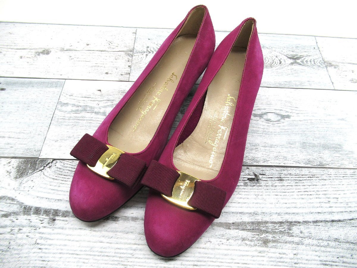 > ☆【B送900円】2003 Salvatore Ferragamo サルヴァトーレフェラガモ ヴァラリボン スエードパンプス パープル×ゴールド金具 6 B