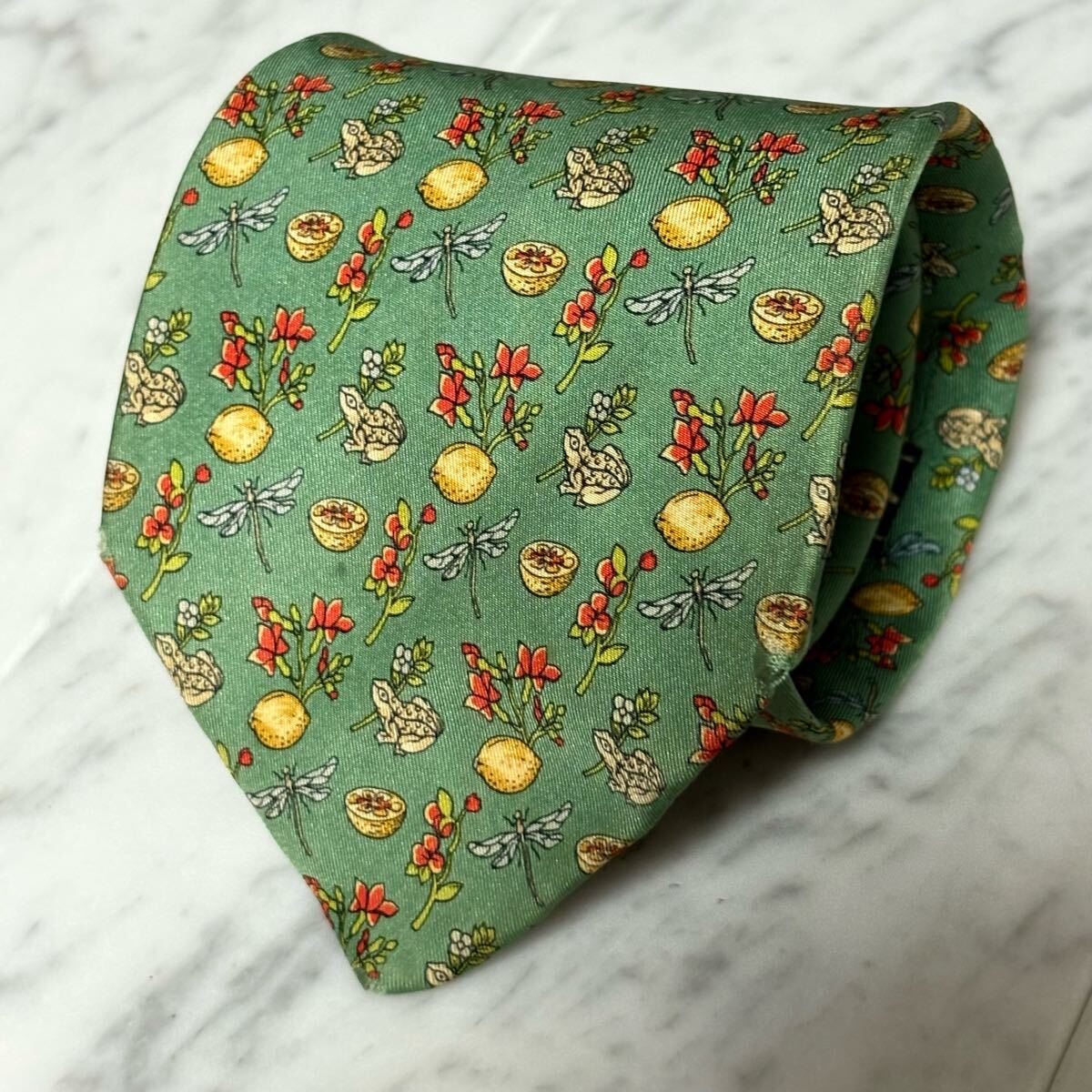 - 770円~ Ferragamo ネクタイ グリーン系 ボタニカル柄 動植物 (GREEN B4)