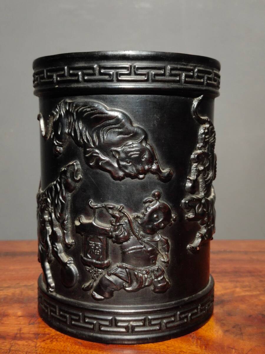 - ▽鴻▽ 黑檀木製 細密彫 虎虎生威紋 筆筒 置物 賞物 古賞物 古董品 時代物 稀少珍品 中国古玩 中国古美術