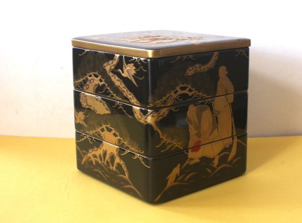- 輪島塗 三段重箱 鶴亀 高砂 翁 三段重 厚みのある金彩 金蒔絵 漆器のお重 /25N5.1-12