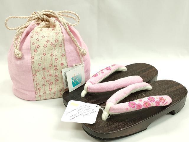 > 平和屋着物*夏物 和装小物 巾着・下駄セット 浴衣 刺繍 桜 右近下駄 桐 金糸 逸品 未使用 CAAQ8361ju