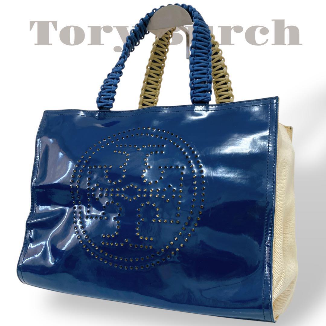 - 希少 トリーバーチ トートバッグ パンチング エナメル×キャンバス 紺色