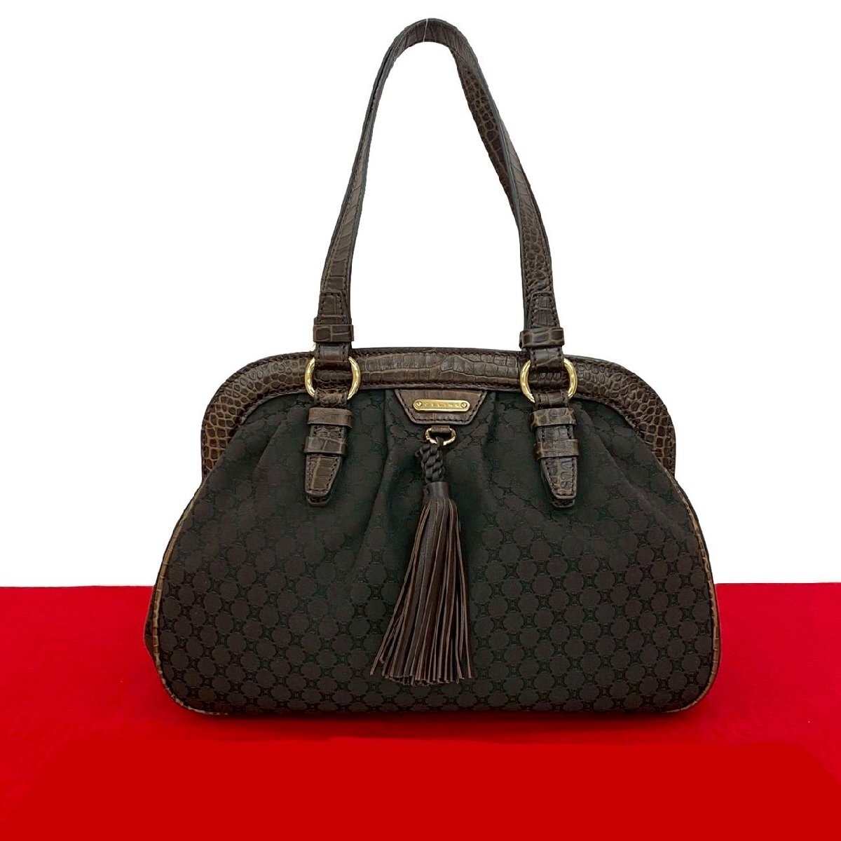 > ほぼ未使用 CELINE セリーヌ マカダム ブラゾン トリオンフ 柄 キャンバス レザー 本革 タッセル トートバッグ ブラウン 茶 39400