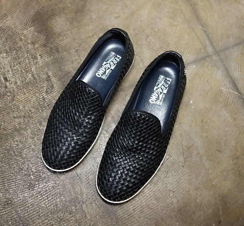 - TK イタリア製 フェラガモ Salvatore Ferragamo ガンチーニ金具 イントレチャート レザースニーカー スリッポン 黒ブラック 7EE