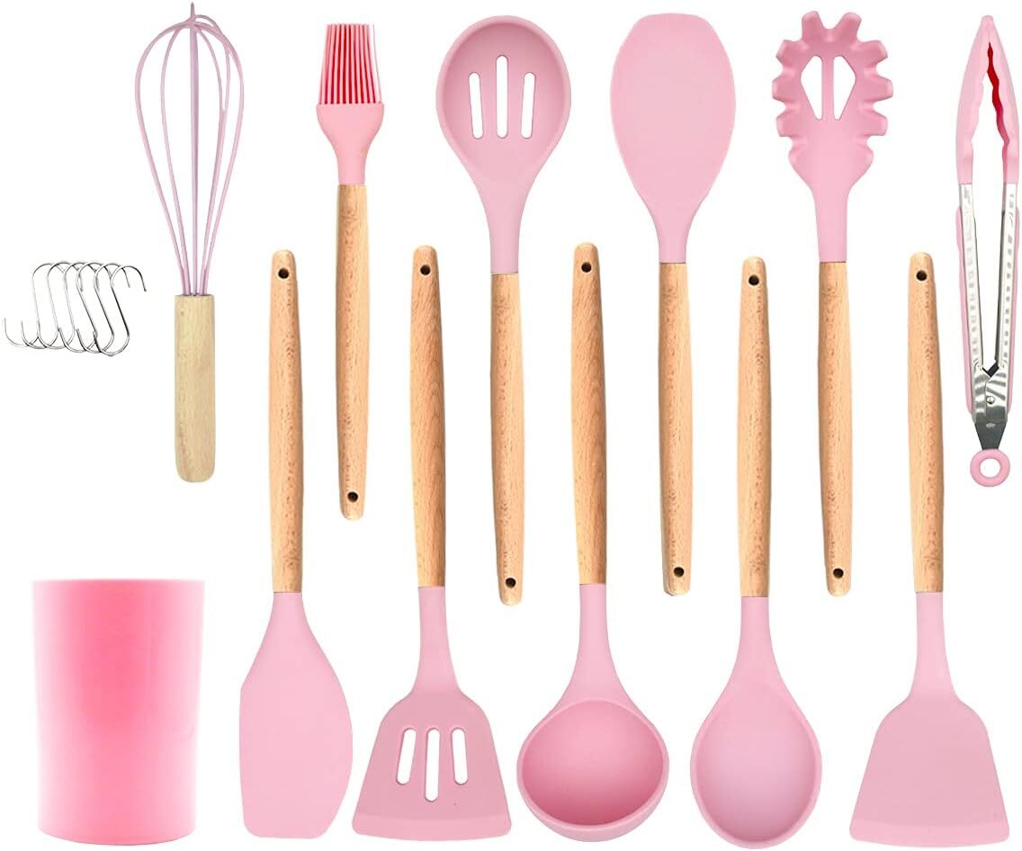 - ピンク色 13点セット キッチンツール セット 調理器具 製菓器具 台所用品 耐熱シリコン 木製ハンドル 食洗機対応 和洋中料理に適用