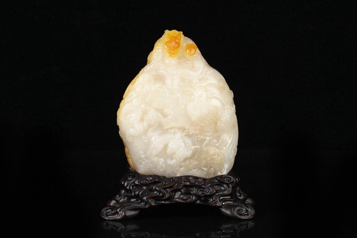 - 「清 滄門作 老寿山石 白田黄石彫り 龍鳳呈祥擺件」極細工 擺件 古賞物 中国古美術 旧蔵出
