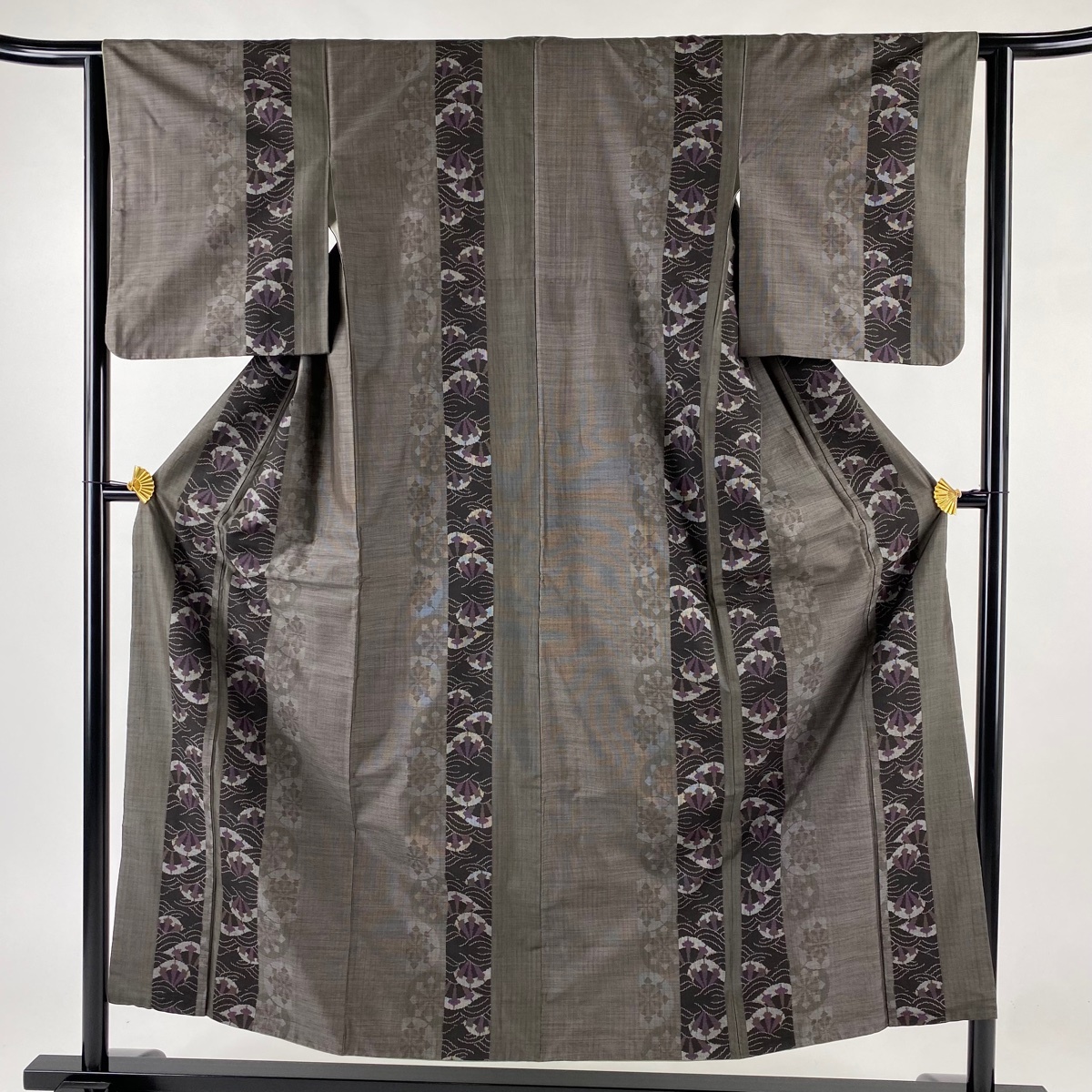 - 紬 身丈153cm 裄丈63cm S 袷 波 源氏車 茶緑色 正絹 秀品 【中古】