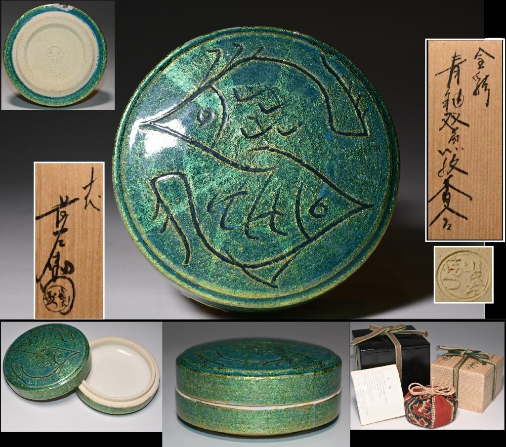 - 大珍品■十代大樋長左衛門(年朗)造■ 金彩青釉双魚紋香合 釉裏金彩 未使用 二重箱 仕覆 共箱・栞付 真贋保証 茶道具 石川県金沢市