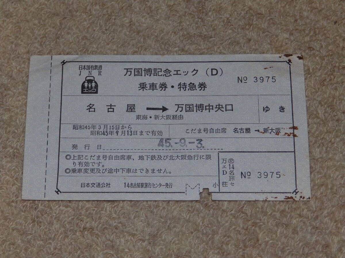 - 万国博記念エック(D)乗車券・特急券 名古屋→万国博中央口 昭和45年9月3日 日本国有鉄道(国鉄) シミあり