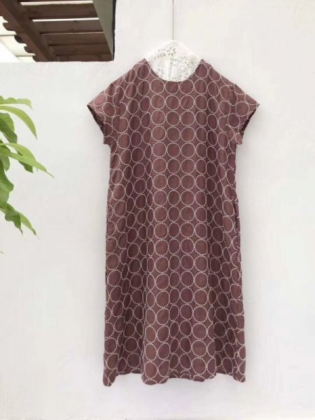 > yh ワンピース サークル刺柄 フリーサイズ 麻100% リネン RINEN ゆったりとした 大人可愛 チュニック 高質 ブラウン系
