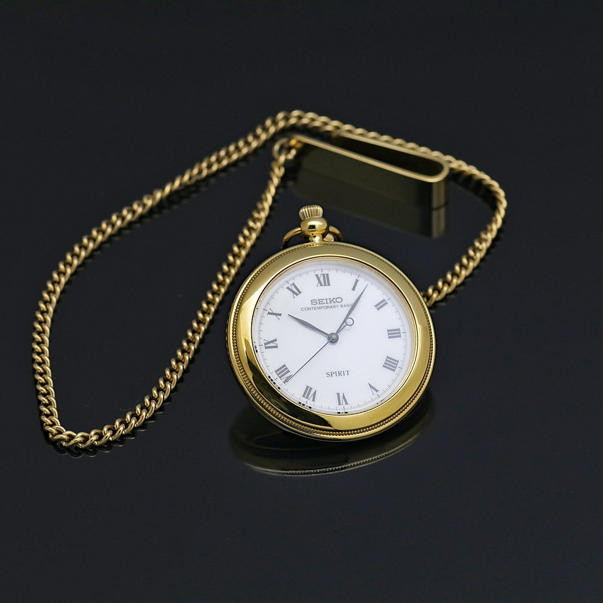 > 美品 電池交換済 SEIKO セイコー スピリット 懐中時計 スイープセコンド SCEZ019 5S21-0A30 GP 白文字盤 保チェーン保存袋付 裏彫有