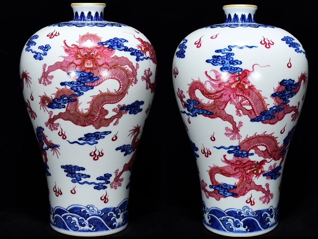 - ■LH172■大清雍正年制銘 青花礬紅龍紋梅瓶 時代物 古玩 唐物 古陶磁器■