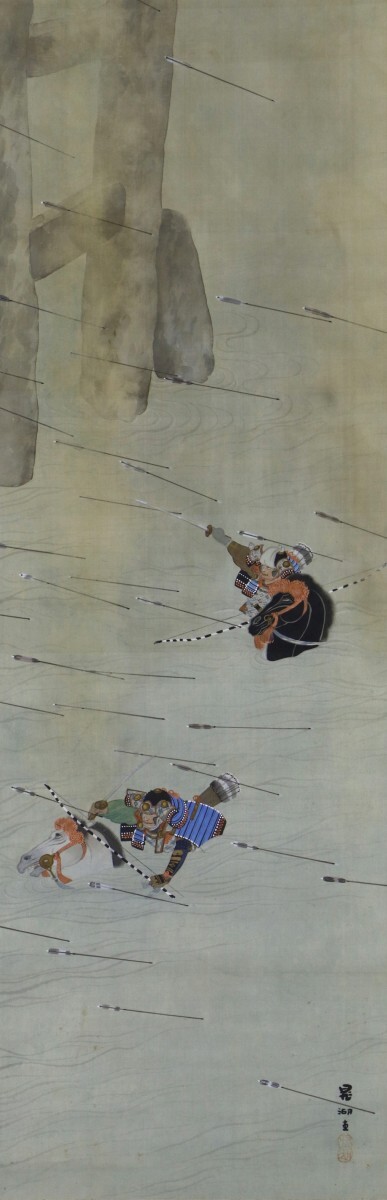 - 【真作】掛軸「鴨下晁湖 宇治川合戦」共箱 明治昭和期 日本画家 松本楓湖門下 歴史画 絵画
