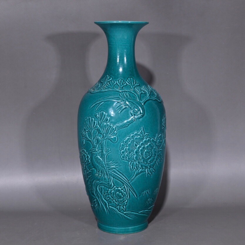 - 蔵友旧蔵出 清 乾隆年製款 藍釉 牡丹花鳥紋 梅瓶 稀少珍品 貴重品 古陶瓷品 置物 古賞物 中国古玩 中国古美術品