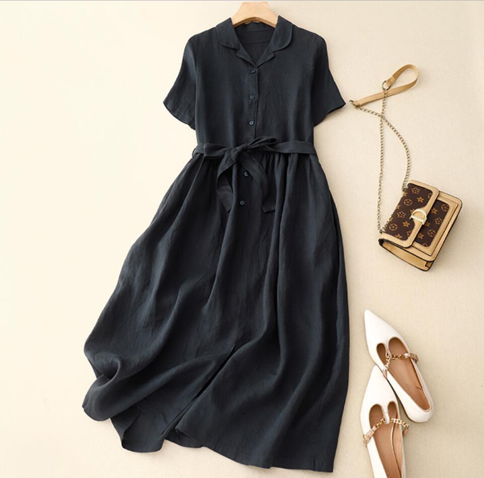 - 新入荷 * ワンピース 綿麻 カジュアル 大きいサイズ 夏 半袖 無地 襟付き ロングワンピース 着痩せ 上品 マキシワンピース * ネイビー