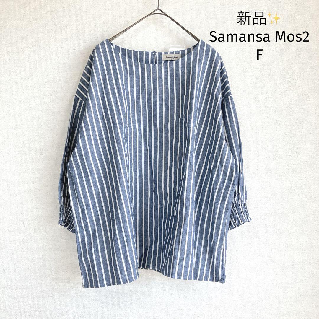 - 新品サマンサモスモス 麻混 袖口シャーリングTブラウス 六分袖 ストライプ