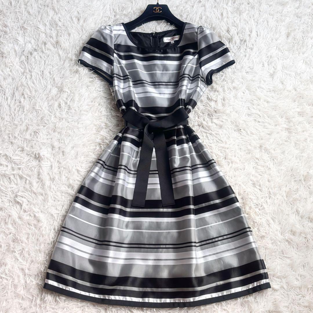 > Super Beauty スーパービューティー ボーダー 総柄 Aライン フレア 袖シースルー 腰ベルト 腰リボン シフォンワンピース レディース 40