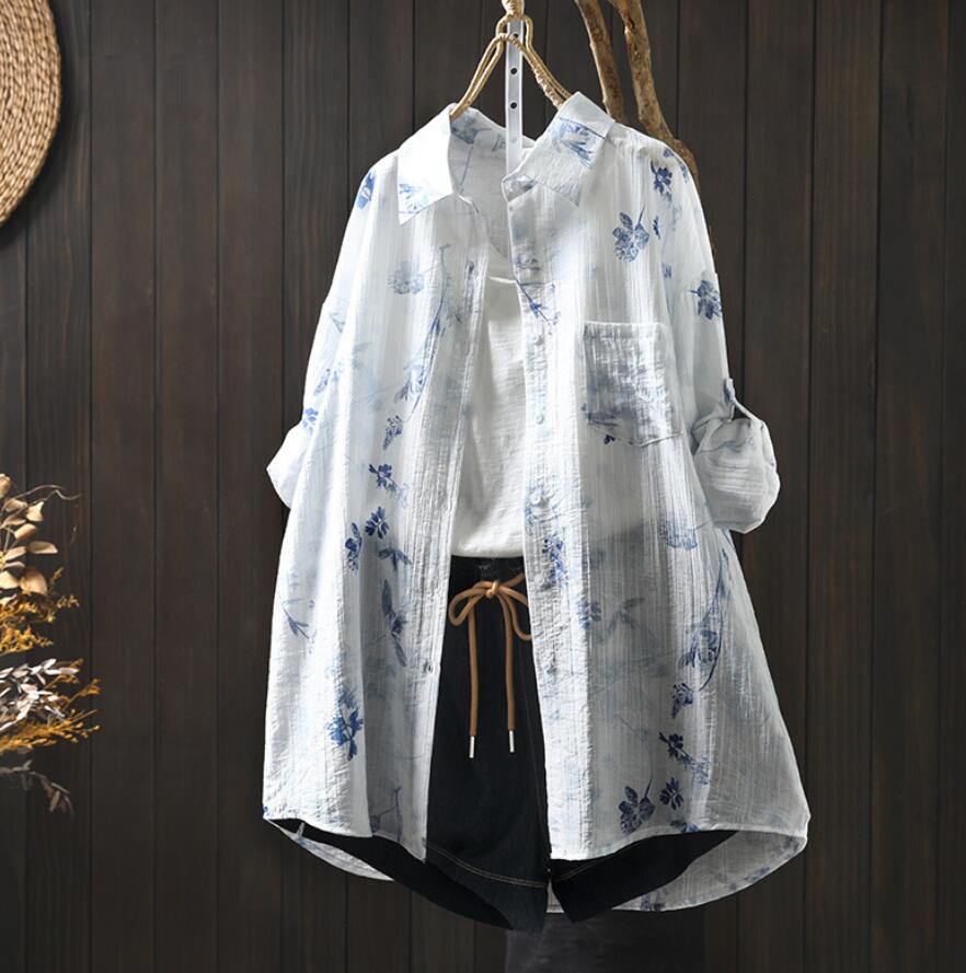 > 人気推薦/ オシャレ 爽やか花柄 チュニック ワイシャツ 大人可愛 ナチュラル ゆったり 日焼け防止 カーディガン / ブルー