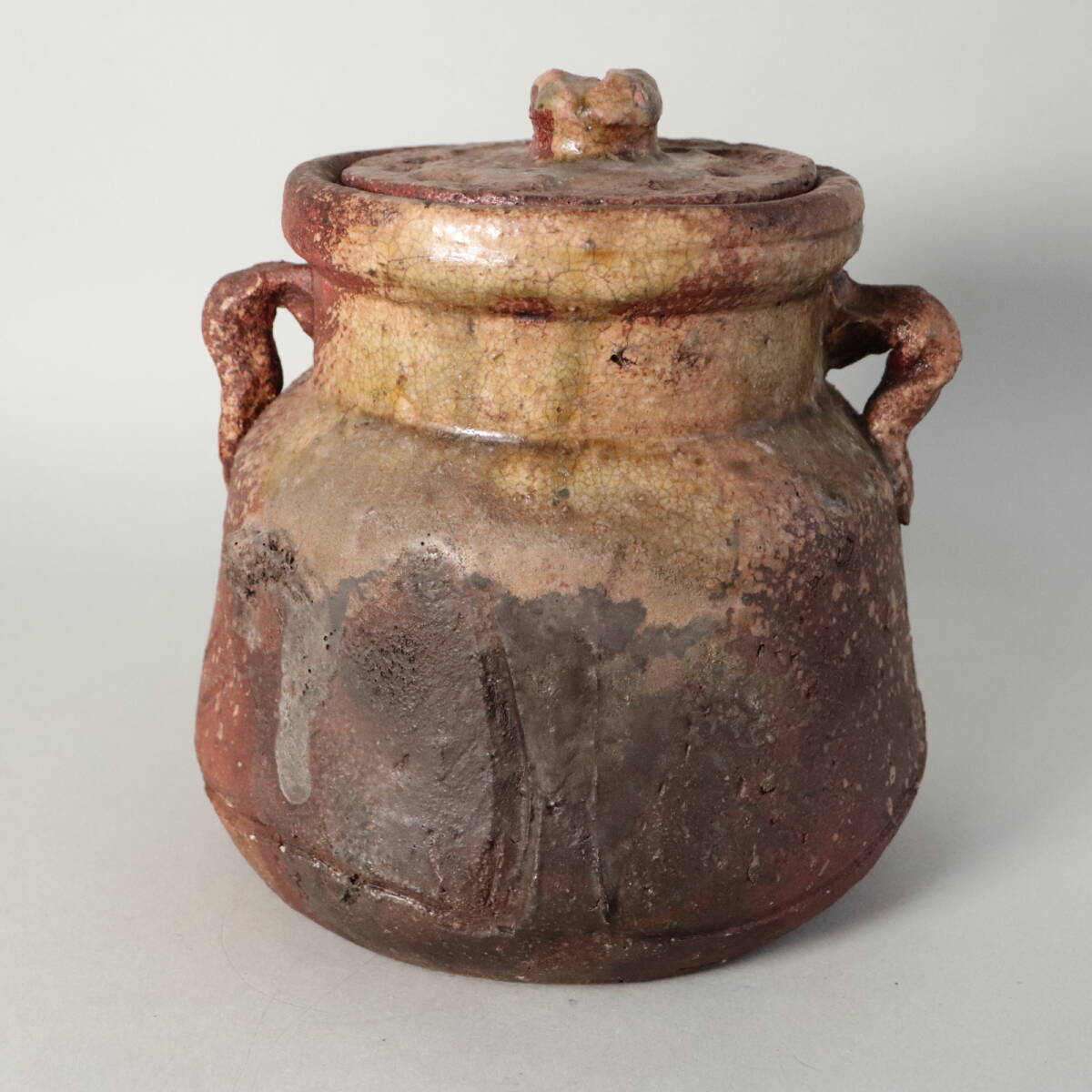 - 古伊賀 写 江戸時代〜明治時代頃 伊賀焼 水指 焼締 自然釉 取手付 荒土 茶道具 蓋物 F0717C7