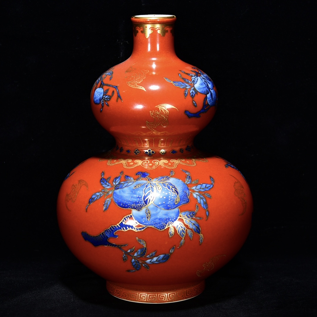 - ■LH206■大清雍正年制銘 青花描金臙脂紅釉三果紋 瓢箪瓶 時代物 古玩 唐物 古陶磁器■