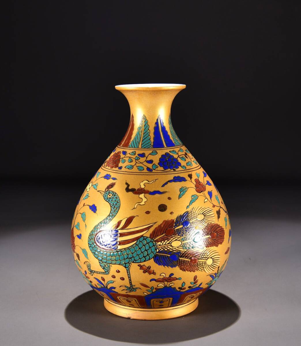 - 蔵友旧蔵出 明 成化年製款 金地 五彩 孔雀紋 玉壺春瓶 稀少珍品 貴重品 古陶瓷品 置物 古賞物 中国古玩 中国古美術品