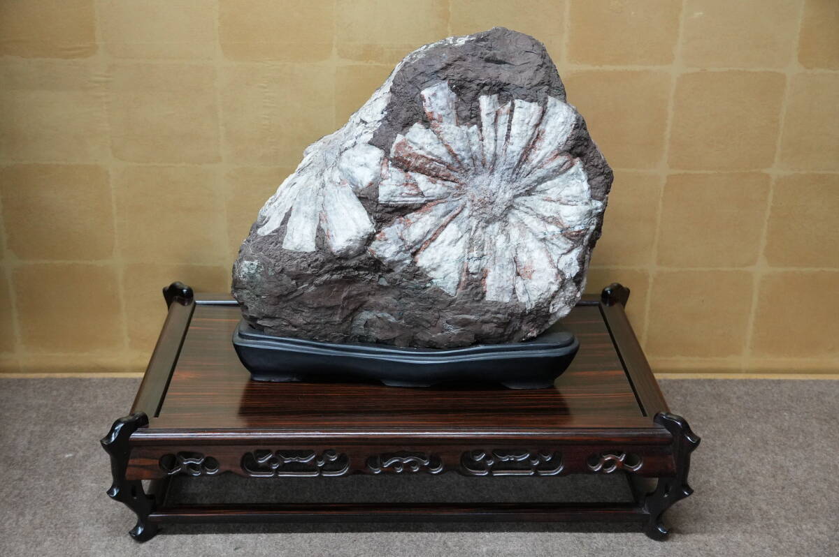 - T1827 愛石家 美石・盆石放出品 特別天然記念物 岐阜県根尾谷産 菊花石 (叩き) 幅38cm 28.5kg 台付き 水石
