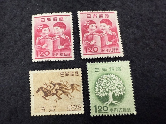 - 57、日本切手 1948年 全国緑化 競馬法25年 教育復興 3種4枚 未使用