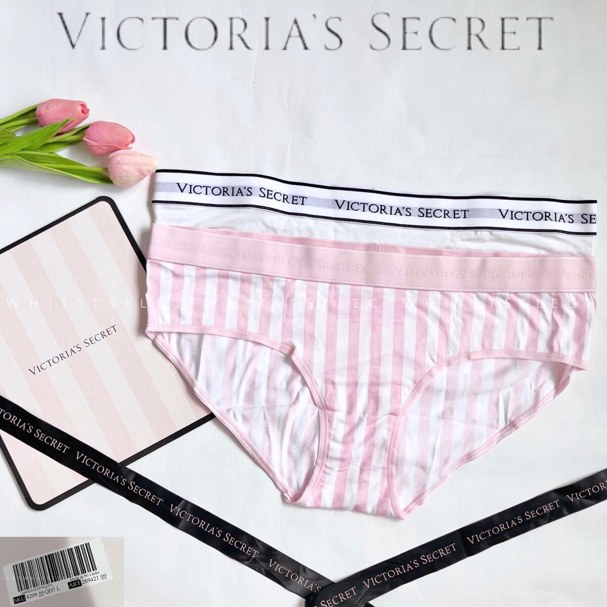 - 【L/2枚】ロゴコットンヒップハングパンティVictoria's Secret ヴィクトリアシークレット ホワイト/ピンクストライプ ロゴゴム