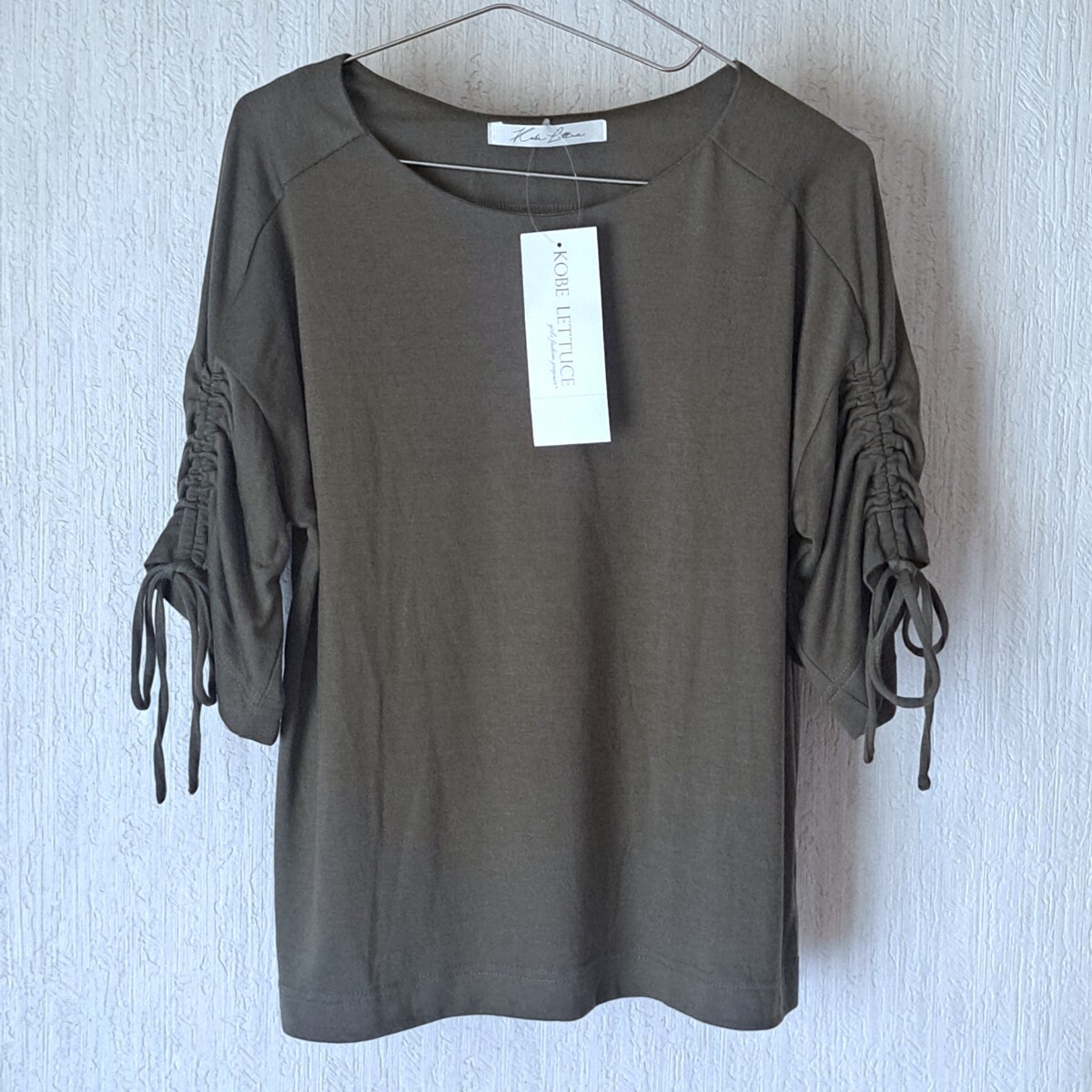 - 新品 お袖シャーリング リボントップスF カーキ系 フリーサイズ 神戸レタス