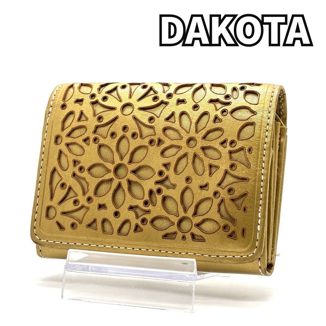 > 1円★未使用品 Dakota ダコタ 二つ折り財布 カットワーク ボタニカル 本革 小銭入れ付き レザー 花柄 レディース 希少 ゴールド