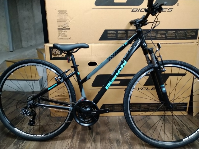 > ビアンキ トレッキングバイク 700x38cタイヤ フロントサス付 380mmサイズ ブラック/チェレステ 新品 即納