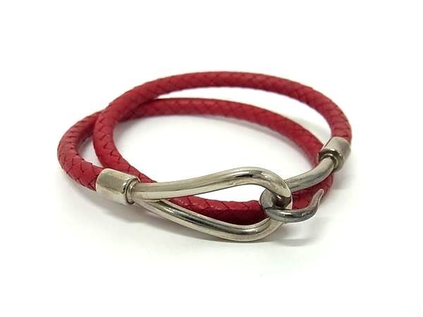 - 美品 エルメス チョーカー ジャンボ チョーカー レザー 2重 ブレスレット 編み込み レッド系 シルバー金具【本物保証】