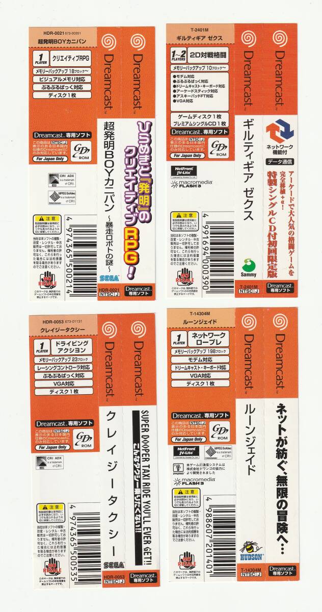 - 「ドリームキャスト 帯 セット №301」(ルーンジェイド、クレイジータクシー、ギルティギア ゼクス、超発明BOYカニパン~暴走ロボトの