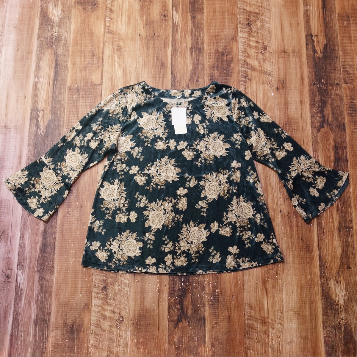 - 未使用 GIVORS ベロア調 花柄 フレアスリーブカットソー レディース 大きいサイズ タグ付き LL LLサイズ ダークグリーン、ベージュ PV1