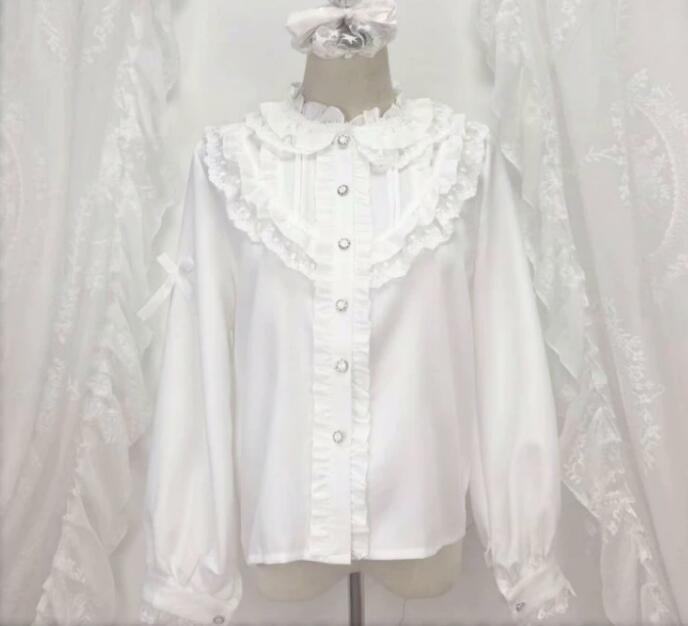 - 新入荷人気推薦ホワイト 長袖 スタンドカラー レースブロッキングフリル リボンロリィタ ブラウスM