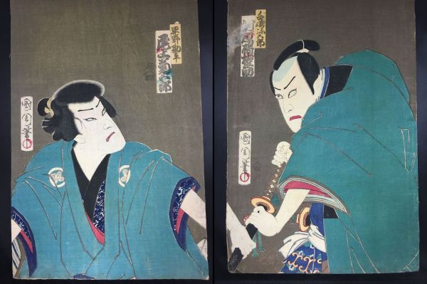 > 《真作》豊原 国周「『仮名手本忠臣蔵』五段目 尾上菊五朗他役者絵 版画二枚」三代豊国門 明治の役者絵の第一人者 版元印有 4393-3500
