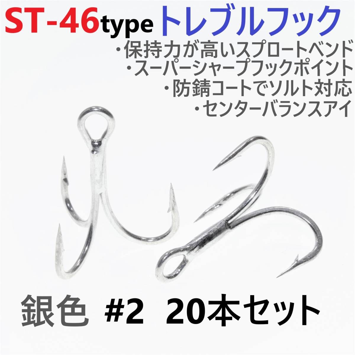 > ST-46タイプ防錆トレブルフック シルバー#2 20本セット 高品質ルアーフック スプロートベンド ソルト対応 トリプルフック