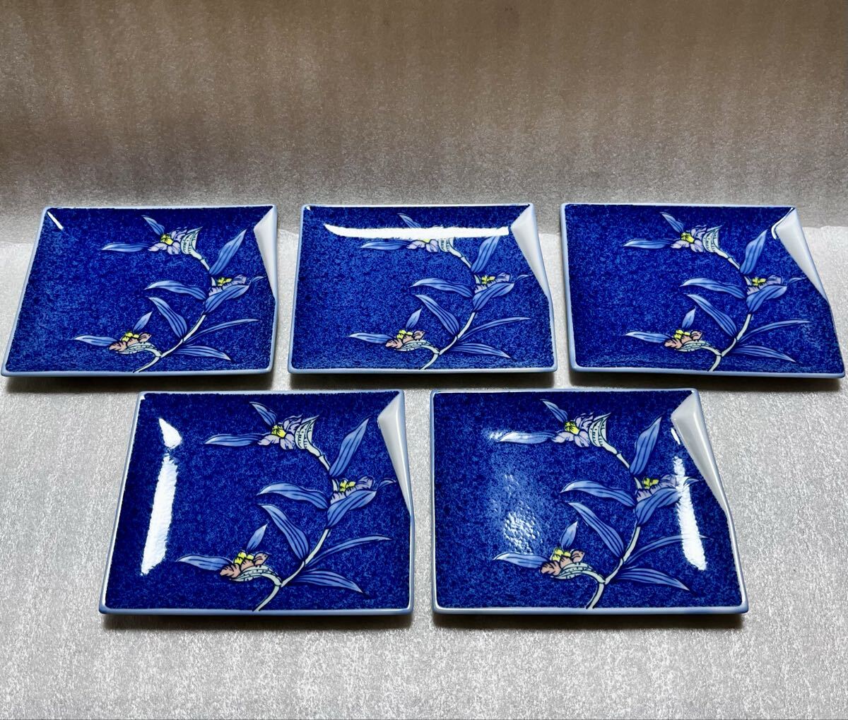 > 未使用 新品 有田焼 変形 角皿 銘々皿 露草 ツユクサ 5客 5枚 5枚セット ブルー ホワイト 青 白 和食器 花