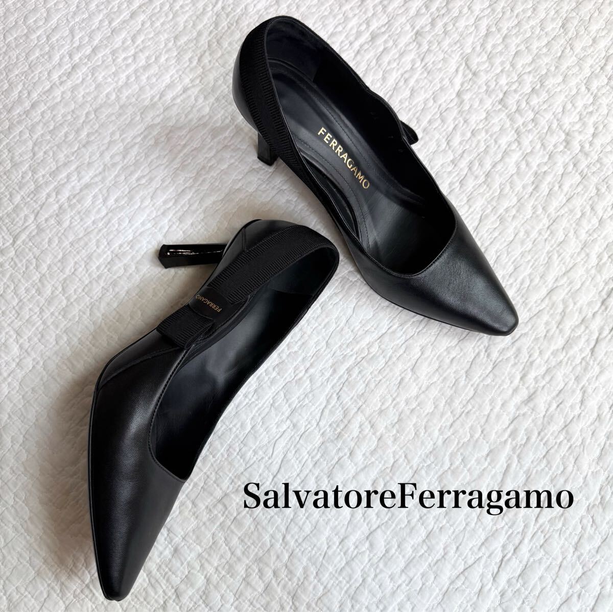 > 美品 SalvatoreFerragamo サルヴァトーレフェラガモ ヴァラリボン レザーパンプス ブラック 黒 7 D 24cm 近年モデル