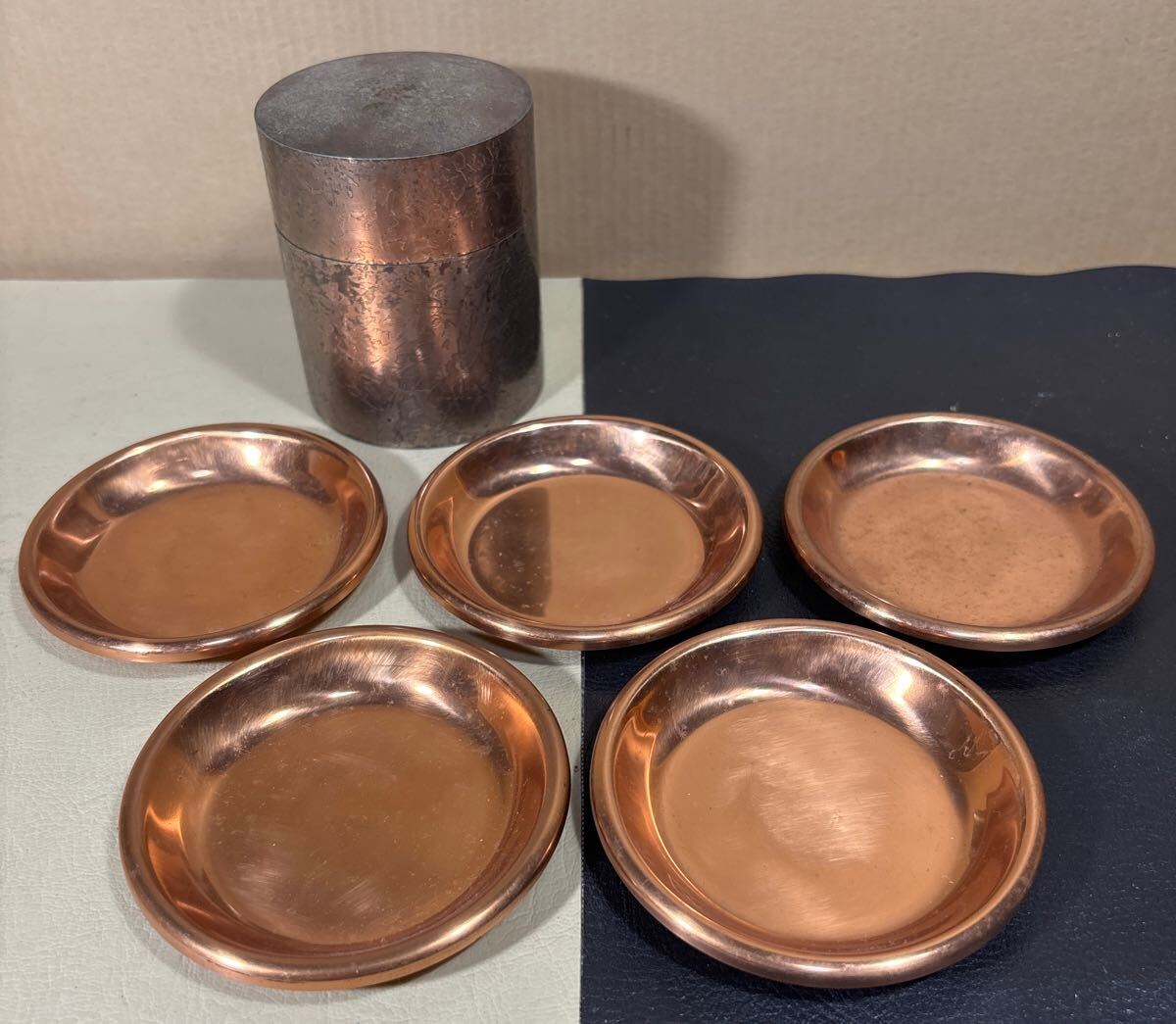 - 瑞両 茶筒 茶道具 茶入 1品 茶器茶托 純銅製 受け皿 茶台 煎茶道具 5品 全6品セット